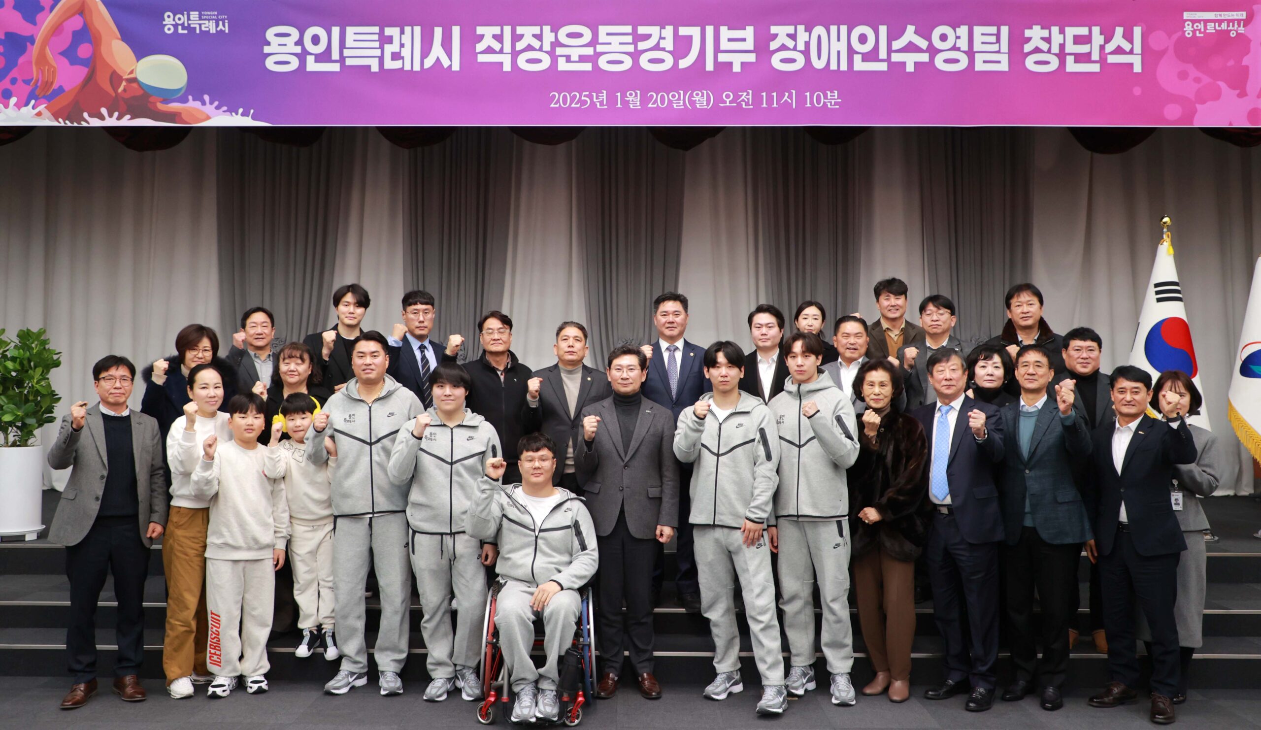 이날 시청 컨벤션홀에서 열린 용인특례시 직장운동경기부 장애인수영팀 창단식에는 이상일 시장과 성백유 대한장애인수영연맹 회장, 선수단 가족 등 70여명이 참석했다.